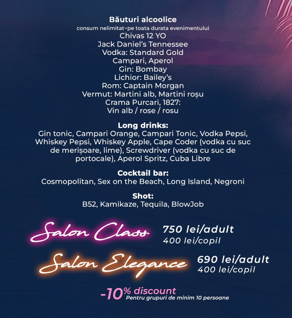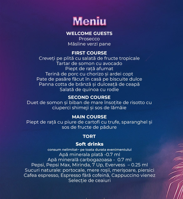 Un spectacol de artificii impresionant pentru a marca începutul noului an, băuturi fine și preparate delicioase pentru o experiență rafinată.